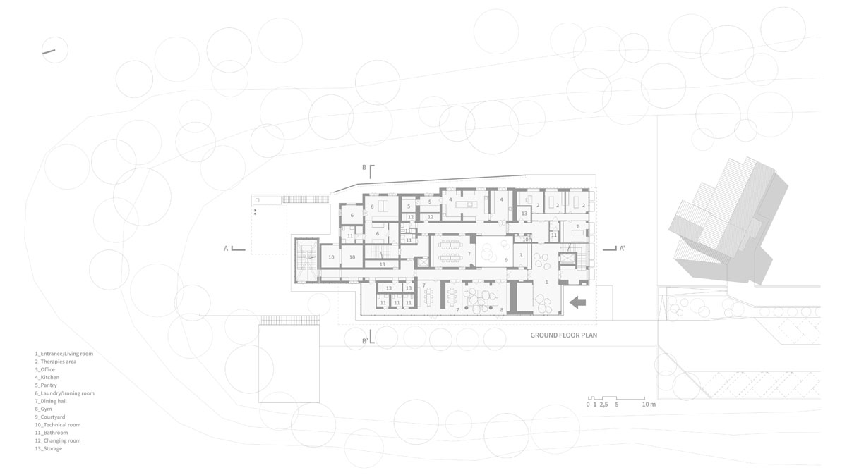 The project is inspired by historical and social values of “home” paired with the spirit of the forested surroundings. A loose arrangement of dormitories are arranged around a central courtyard and clad with a perforated green metal skin that is held off of ground level to offer transparency to the surrounding landscape, which is peppered with centuries-old cypress trees.