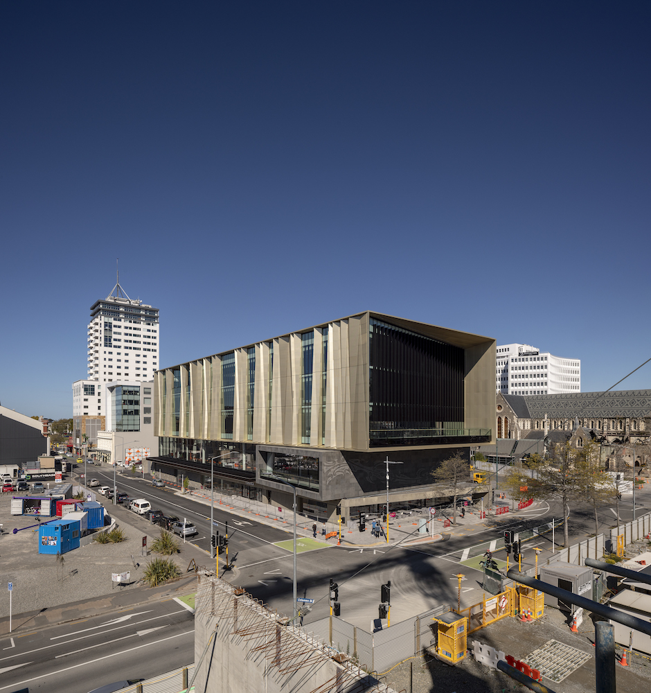 The 102,000-square-foot library rests atop a rectangular stone-clad podium detailed with expansive representations of Māori artwork. Rising to a height of five stories, the facade fissures to orient itself toward local geographic landmarks, including the mountain ranges of Maungatere, Ka Tiritiri o te Moana, and Horomaka.