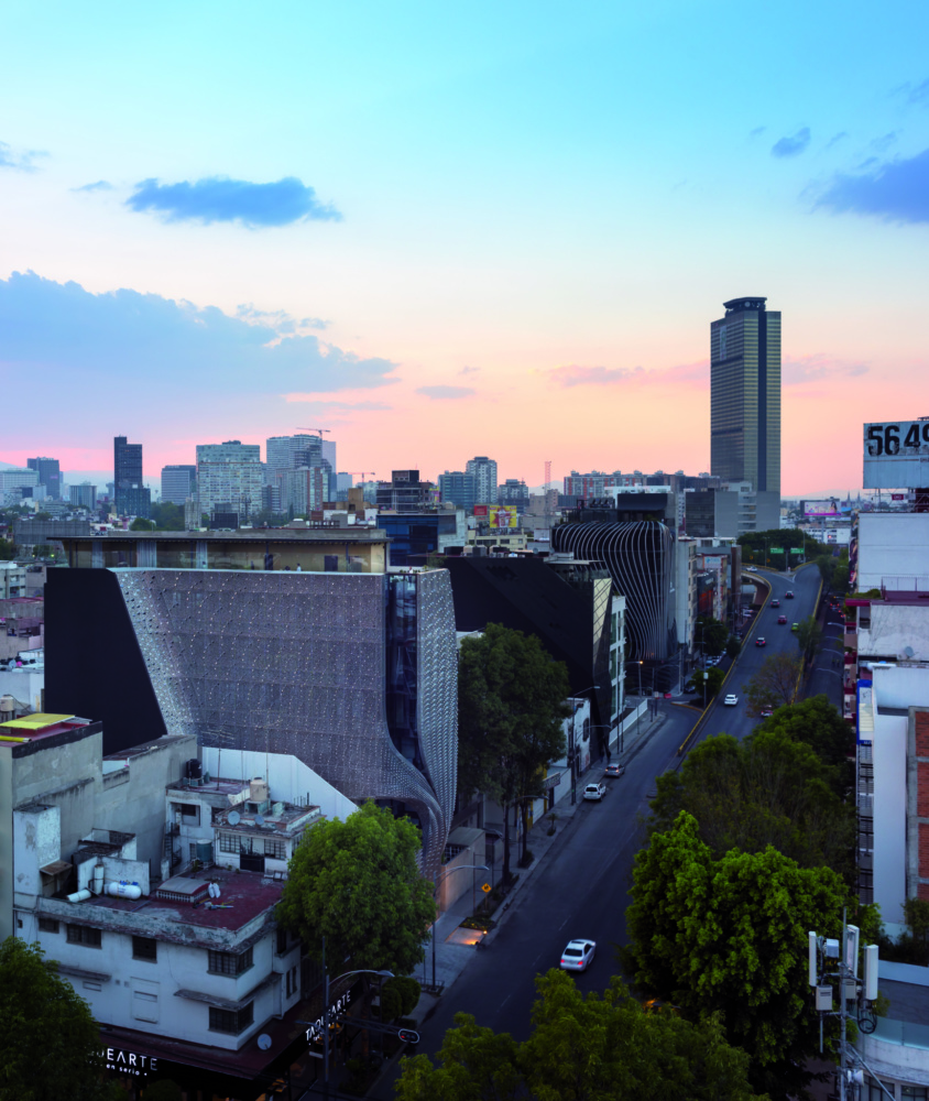 Since 1997, California’s Belzberg Architects has consistently delivered forward-thinking facade systems across North America. Profiles is a six-story commercial building draped in a diaphanous and perforated carbon-steel veil that partially resembling a stylish extraterrestrial ship landed in the heart of Mexico City.