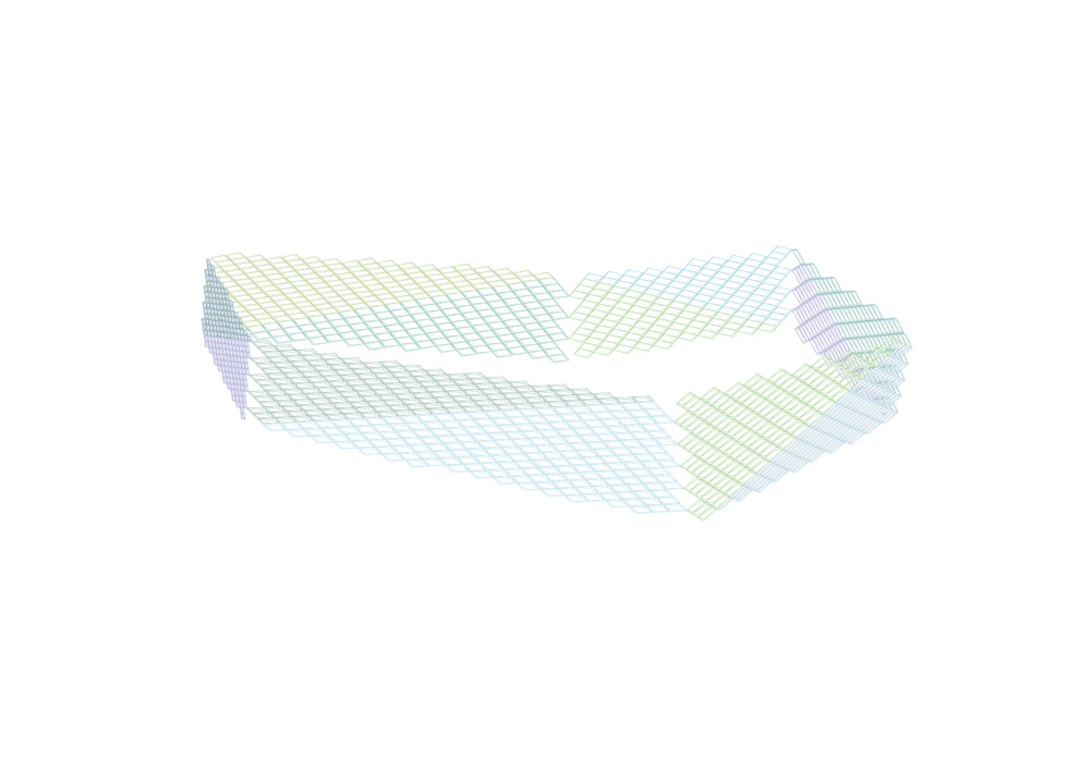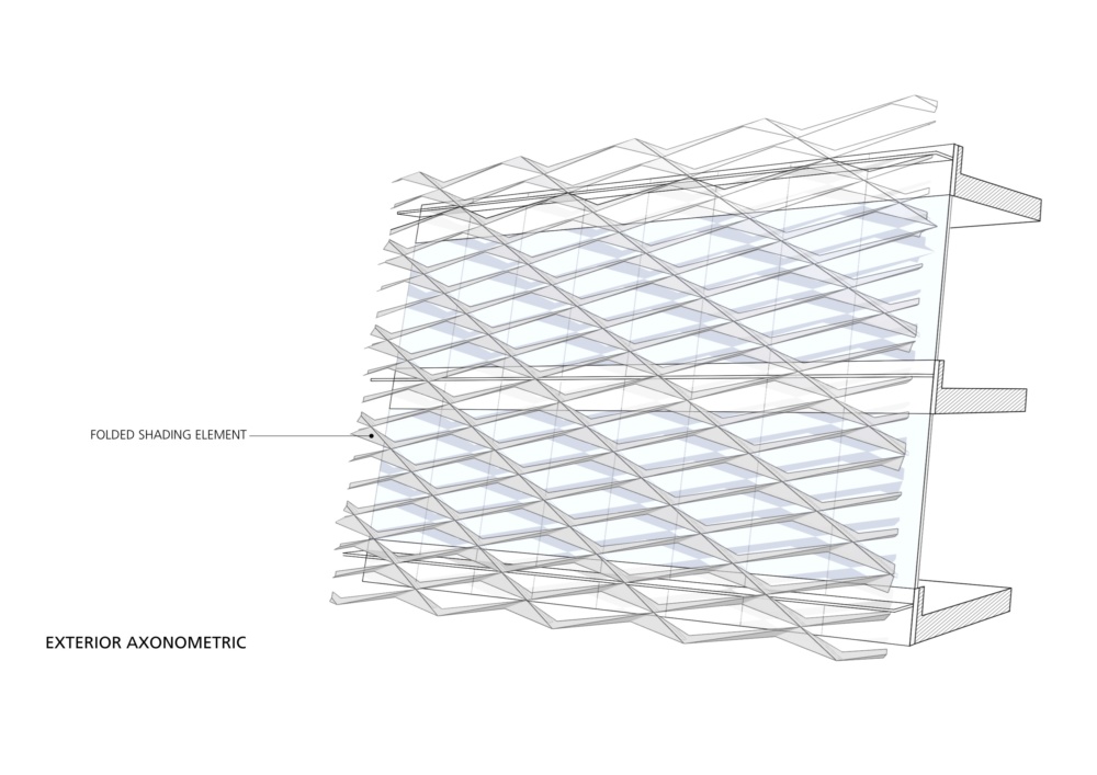 The second skin of the building consists of a continuous aluminum screen that runs across the underlying glazed facade. Each of the facade’s nine distinct planes is shaded with a unique variation of the screen; the skin on the north has relatively large openings while that on the south is more constrained. The panels consist of two folded aluminum pieces joined together to resist bending.