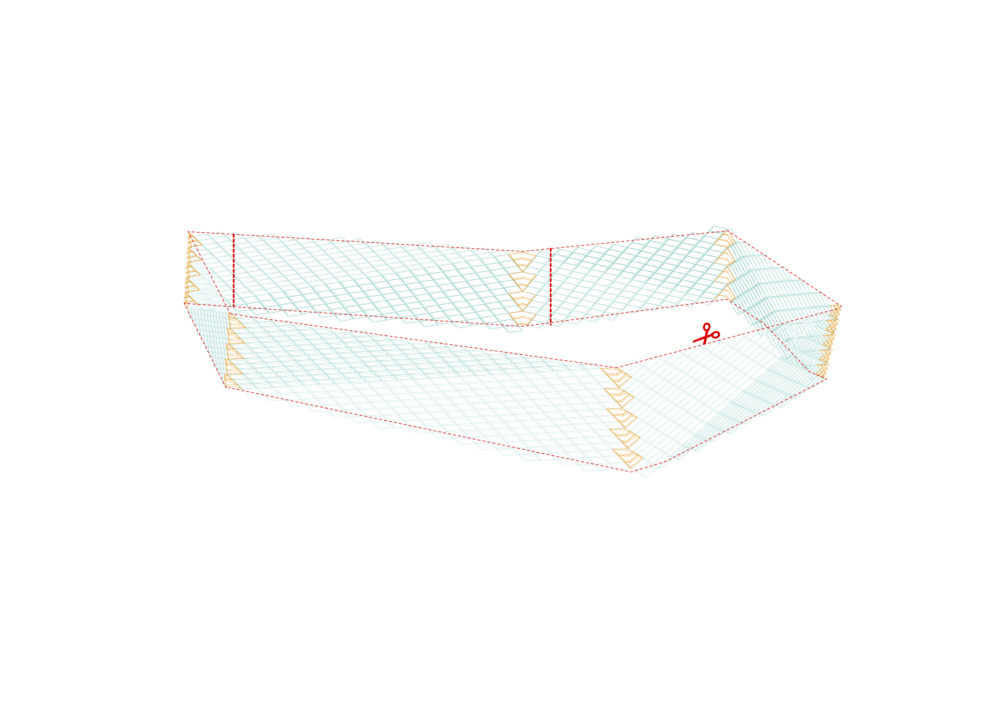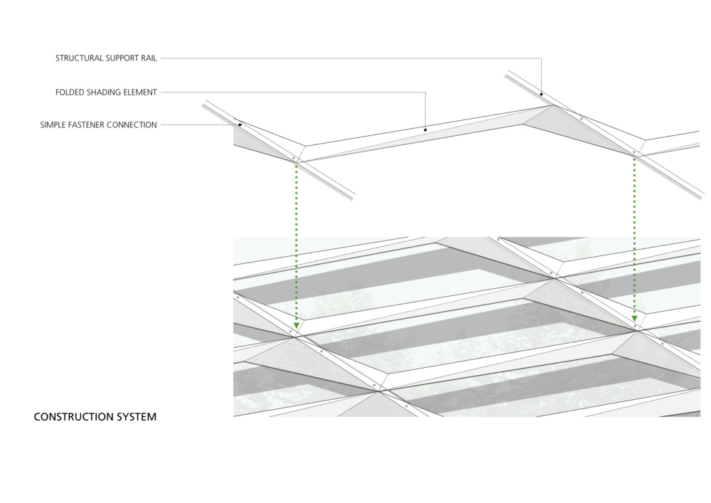 The second skin is located approximately 2.6 feet from the inner facade, allowing for the insertion of a maintenance catwalk and over half-a-foot of space for the secondary structure supporting the shading panels. The secondary structure is composed of a series of diagonal steel rails running parallel to each other. Every short end of the panels are connected to the steel rails via simple fastener connections. Armatures extending from the inner facade support both the catwalk and the steel rail system.