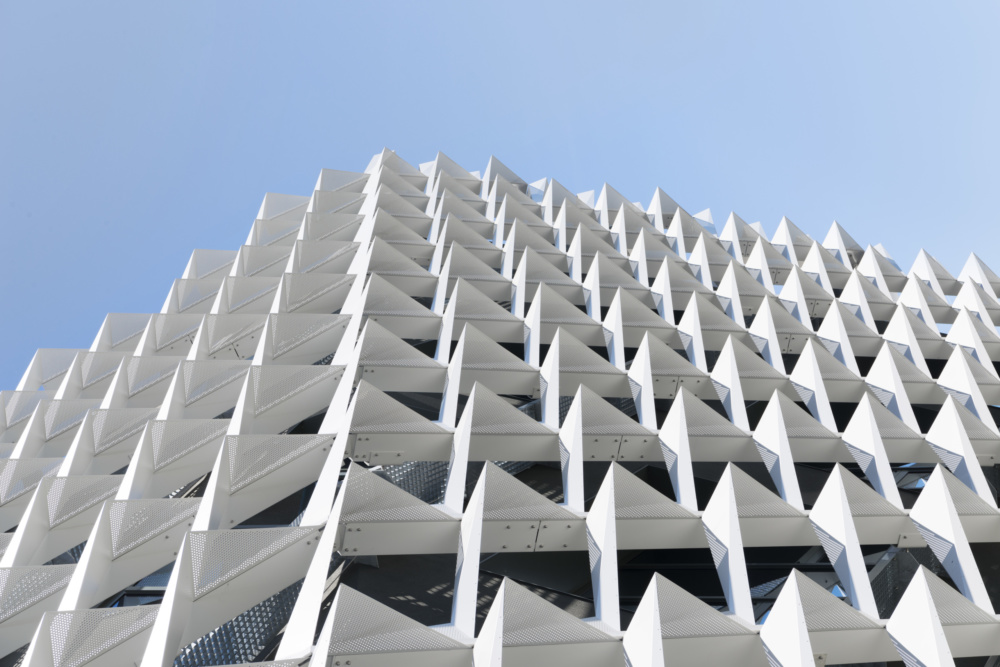 For the shading requirements of the building, Behnisch Architekten developed a set of parametric guidelines for Rhino, Grasshopper, and AutoCAD. The length of the “P” line, the protruding-perforated aluminum flap, was determined by the “V” plane perpendicular to the facade, and the “H” plane parallel to the facade. After producing scores of digital simulations for sun and heat protection, light enhancement and glare, the design team built multiple physical models that were tested under artificial lighting.