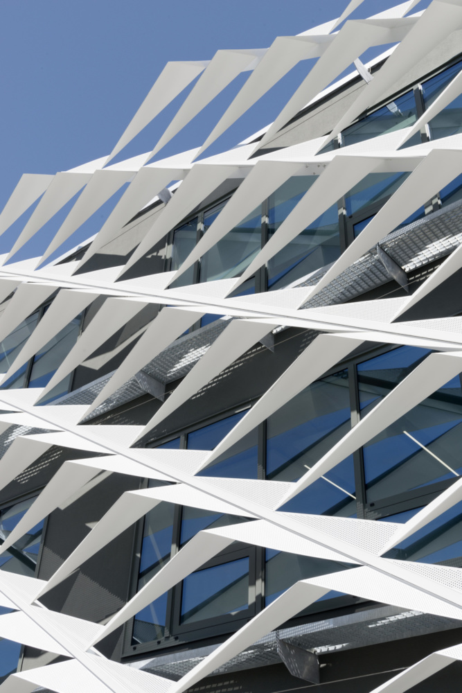 According to the design team, one of the greatest challenges of the project was the connection of the bands of aluminum apertures across nine unique facade planes. To maintain the visual continuity of the second skin, Behnisch Architekten collaborated with manufacturer and installer Sottas SA to produce a unique seam of aluminum pieces for each corner.