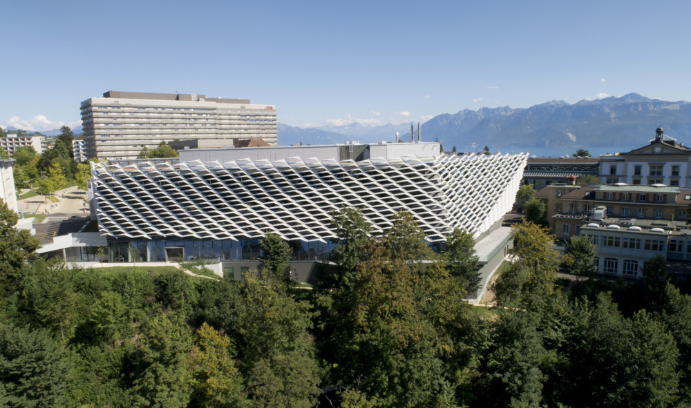 Behnisch Architekten’s AGORA Pôle de Recherche Sur le Cancer in Lausanne, Switzerland, overlooks the historic core of the centuries-old city from a prominent ridgeline within the city center, contorting itself into multiple planes of curtain wall shaded by a continuous band of aluminum apertures.