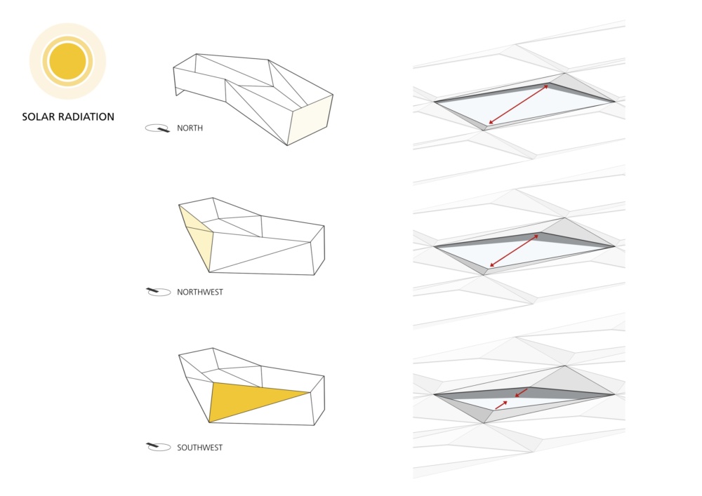 “The optimization of the facade is controlled both by the aperture and its orientation, which respond to the orientation of the glass surface and its type of glass,” said the design team. “The same solar performance can be achieved for every given angle of the sun with an array of different geometries that offer all the different view openings and qualities.”