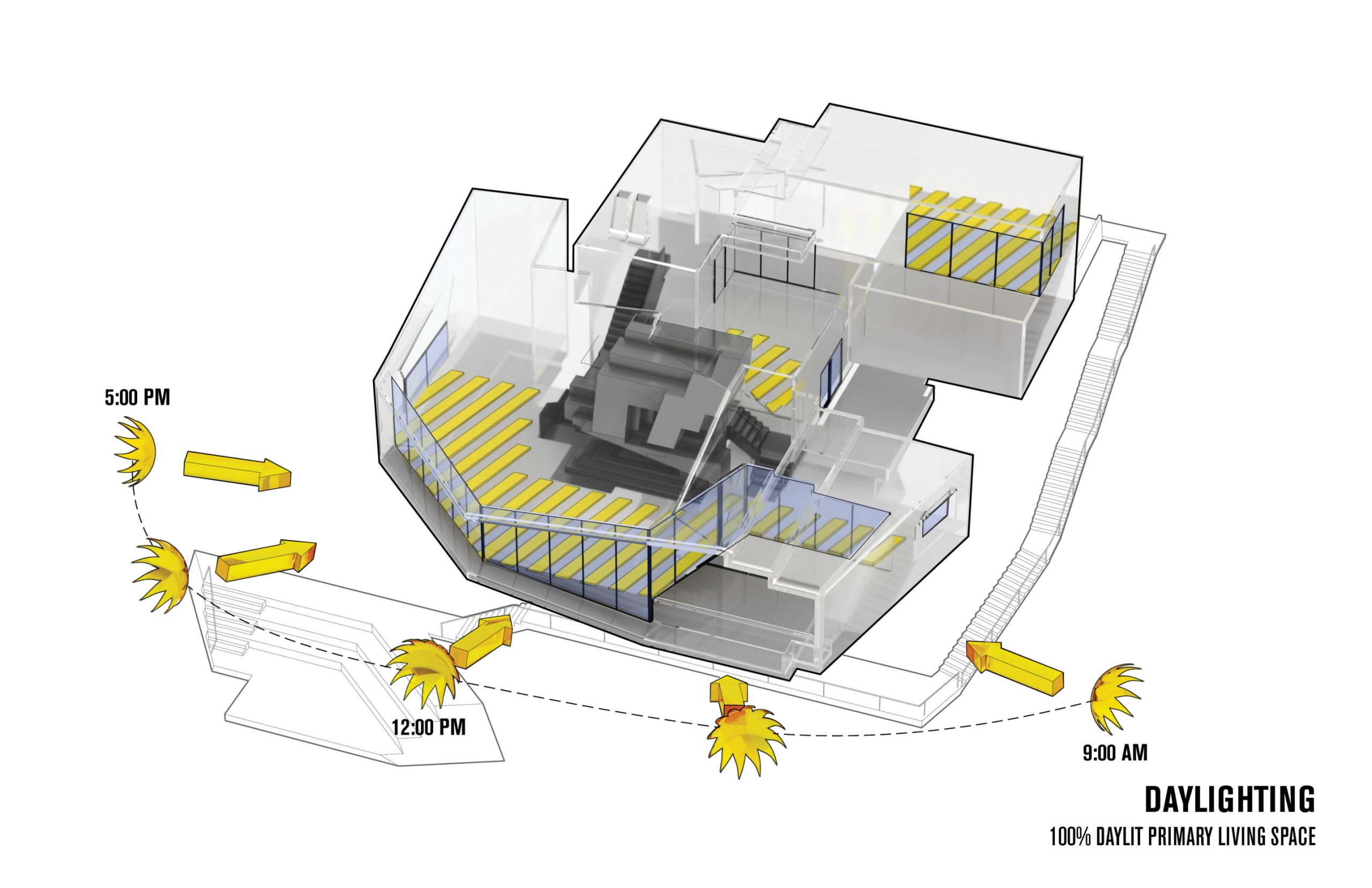 Envisioned as something of a glistening “black diamond” nestled atop a snowy mountainside, the Dark Chalet is topped with an array of black glass resembling photovoltaic panels seamlessly blended with glossy aluminum composite skin. “The design mantra of the Dark Chalet has been ‘zero hardware,’ meaning that we want to maintain mysterious effects by suppressing signs of how it was built—not unlike an SR-71 spy plane,” Wiscombe noted. Once complete, the photovoltaic panels are projected to bring the building system to 362 percent energy positivity; enough to power itself and a handful of neighbors.