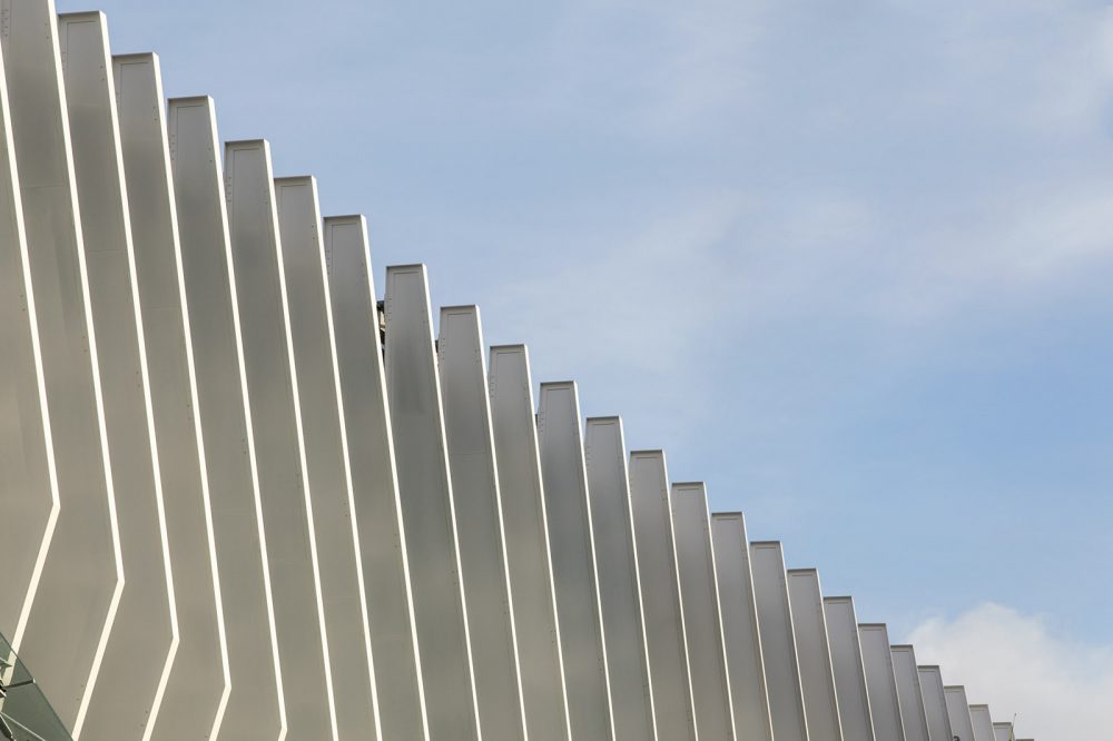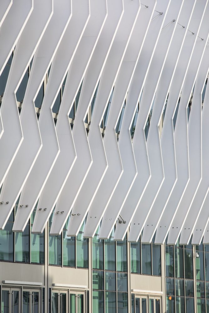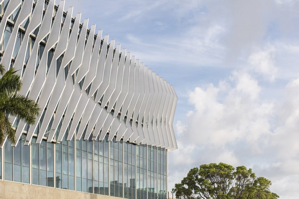 The facade consists of more than 500 angled “fins” constructed out of aluminum plates. Each fin is braced back structure-side and stainless steel struts tie them together to combat lateral loads from hurricanes as well as to account for acoustical vibrations. Behind the rolling facade, the building is clad in a high performance unitized curtain wall with a .23 solar heat gain coefficient. A structural steel backup with an aluminum enclosure supports the cantilevered fins every 15 feet along the curtain wall.