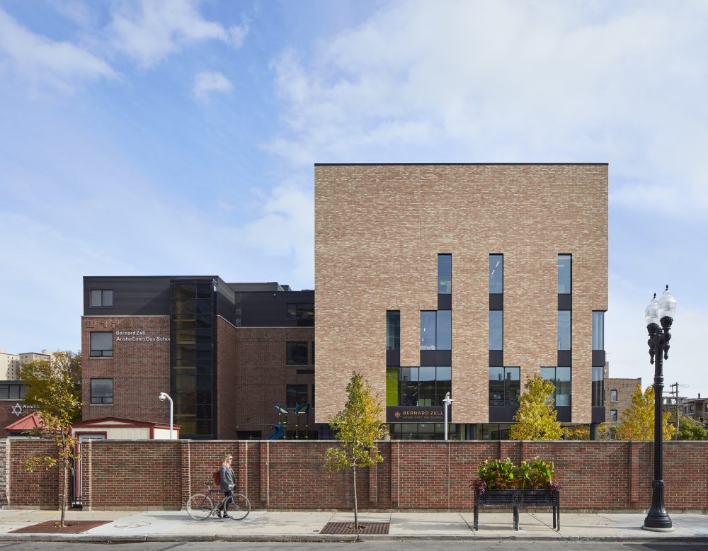 Constructed in Chicago’s Lake View neighborhood just a few blocks west of Lake Michigan, the expansion of the Bernard Zell Anshe Emet Day primary school cuts a fine figure. The project, completed in 2019 and designed by Chicago firm Wheeler Kearns Architects, features a veil of light-beige brick draped over a rectangular volume and studded with vertically-oriented ribbons of glazing.