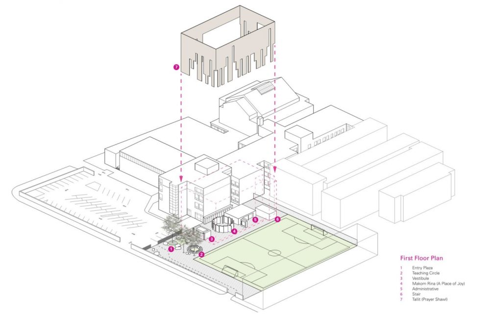 The 32,000-square-foot project is an expansion of the preexisting Hebrew school and synagogue, one of the oldest in Chicago. Both have shared the same facilities since 1948 and were accessed through a rather drab entrance located on the parking lot. The expansion furthers the individual identity of both institutions and reorients the school towards a newly constructed plaza and loggia.