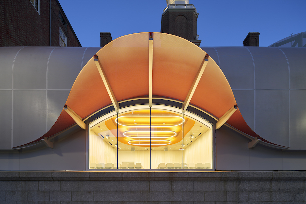 Coloration was not the only tool used by WORKac to blend the extension with the PWIC. Individual panels on each facade layer are clearly defined by joints and seams, which, coupled with an oversized caricature of an eyebrow dormer found at the auditorium, are a lighthearted nod to contextual historic detailing.